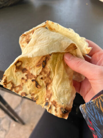 Dabei wird Teig großflächig ausgerollt und nur für wenige Sekunden an eine heiße Ofenwand gepresst. Somit bleibt das Fladenbrot außen knusprig und innen weich.